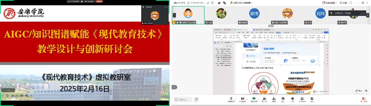 为积极响应人工智能时代对教育变革的号召,推动AI技术在《现代教育技术》课程中的深度融合,有效推动课程改革与建设,2025年2月16日晚上,信息技术教研室组织召开课程研讨会,此次活动以“AIGC/知识图谱赋能《现代教育技术》教学设计与创新”为主题,课程团队及《现代教育技术》虚拟教研室全体成员参加会议,会议由课程负责人宋权华主持。