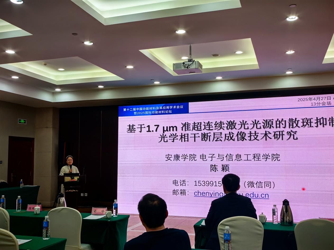 陈颖博士在会上作了《基于1.7μm准超连续激光光源的散斑抑制光学相干断层成像技术研究》报告。介绍了研发可调谐的准SC光源,通过光谱域复合方法,将系列 OCT 图像进行叠加平均,显著改善成像质量的研究工作。