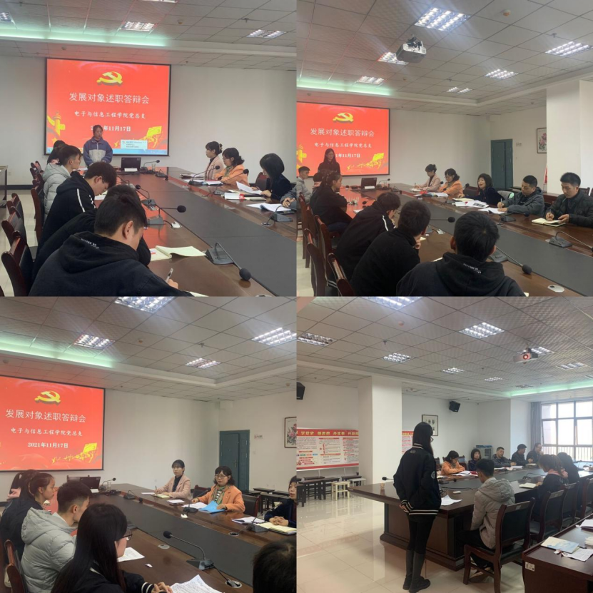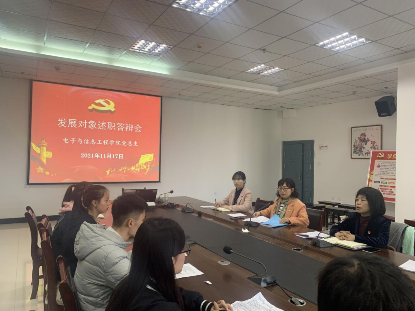 2021年11月17日下午,公司党总支在逸夫科技楼九楼会议室召开发展对象述职答辩会。党总支书记于咏梅,副书记蔡正旺,组织委员成英丽,员工第一党支部书记程晓梅、支委张宇航,员工第二党支部书记李章雨、支委石纭昊以及公司全体第23期发展对象参加答辩会。会议由党总支组织委员成英丽主持。