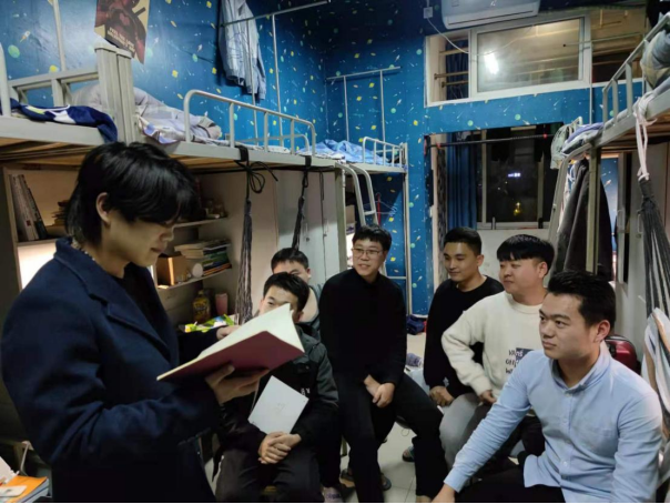 董会刚、陈昱江同学进入员工宿舍9-432首先带领同学们观看“100工程”第四集《魏野畴事迹展馆》,从发轫五四、播火三秦、建党西安、兵运皖北、暴动阜阳、蒙难临泉、彪炳史册七个部分为大家讲述魏野畴烈士生平事迹,学习革命前辈用实际行动诠释了不怕牺牲、不屈不挠、意志坚定、一心向党、无私奉献的大无畏精神,引导员工树立责任、担当意识,坚定理想信念、厚植爱国情怀。宣讲的最后,董会刚带领同学们学习党的十九届六中全会精神。