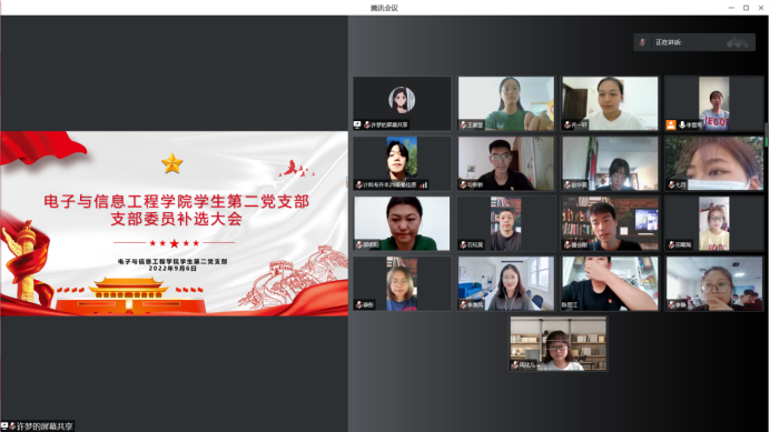 由于员工第二党支部委员会原支部宣传(统战)委员蒋帅已经毕业离校,为确保党支部班子健全、稳定并有序开展工作,根据《中国共产党章程》规定、《中国共产党基层组织选举工作条例》和《中共Bsports委员会二级党组织换届选举工作方案》要求,2022年9月6日,Bsports必一体育员工第二党支部通过线上腾讯会议召开支部党员大会,顺利完成支部委员会补选工作,补选出了新的支部委员会宣传(统战)委员。会议由员工第二党支部书记李章雨同志主持召开。