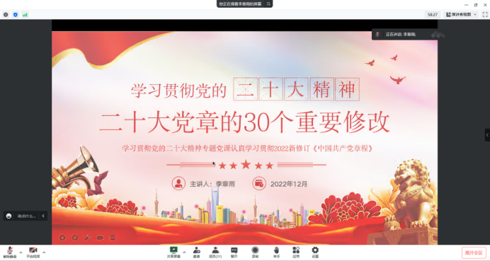 为深入学习贯彻党的二十大精神,深刻领会、准确把握党的二十大精神实质和丰富内涵,切实引导党员把思想、认识和行动统一到学习、宣传、贯彻党的二十大精神上来,2022年12月27日,Bsports必一体育员工第二党支部书记李章雨以围绕学习宣传贯彻党的二十大精神,从二十大主题、社会变革、历史地位、时代要求等方面对党的二十大重要内容进行了详细解读,结合自身学习体会和工作实际,深入浅出地为全体党员上了一堂生动的专题党课,推动党的二十大精神学深悟透、落到实处。