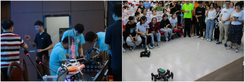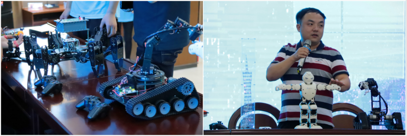 随后,ICT创新公司的员工团队带来了科技创新作品实物展,邹圣雷作为指导老师分别从作品的应用场景、设计思路和技术实现过程等方面逐一介绍了舞蹈机器人、手语翻译手套、便携式移动在线水质检测系统、履带式机械臂、六足仿真机器人等科技作品。在科技作品的介绍中,邹老师穿插引入“中美贸易战”中两国在科学技术实力方面的差距,勉励在座的同学们,努力学好专业知识,提高职业技术素养,为中国科技强国战略贡献自己的力量。之后,同学们观看了带来的科技作品演示,同学们兴趣浓厚,热情参与。