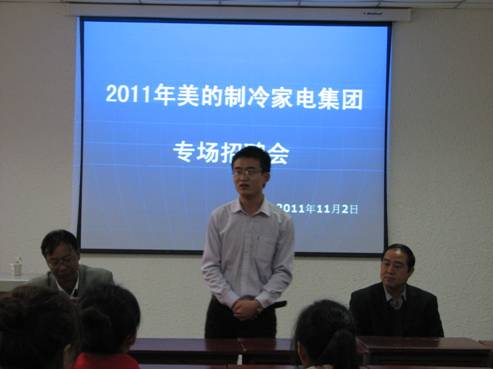 11月2日上午,农生院、中文系、经管系和电信系在1429联合举办了美的集团2011年专场人才招聘会。美的集团制冷部招聘经理沈海,农生公司党总支书记屈国胜,电信系党总支书记李红兵,就业处综合管理科科长刘连德,电信系学办副主任石纭昊,经管系辅导员王远银,电信系、经管系、中文系、农生院共60余名同学参加招聘会,会议由李红兵书记主持。