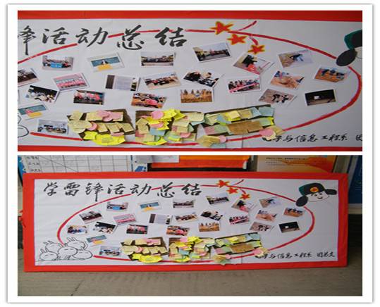 利用学雷锋活动月对全系同学开展“践行雷锋精神 塑造美丽心灵”的教育活动,利用板报进行宣传,通过板报,号召全体员工积极参加学雷锋实践活动,弘扬“团结、友爱、互助、奉献”的雷锋精神。