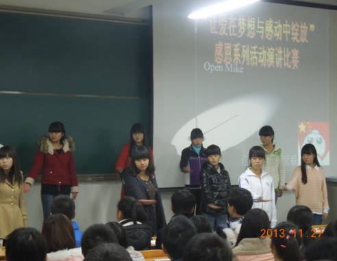 2013年11月27日晚,电子信息工程系团总支在 1号教楼1305室举行“让爱在梦想与感动中绽放”演讲赛决赛,辅导员成英丽,王贵新及2013级新生参加。