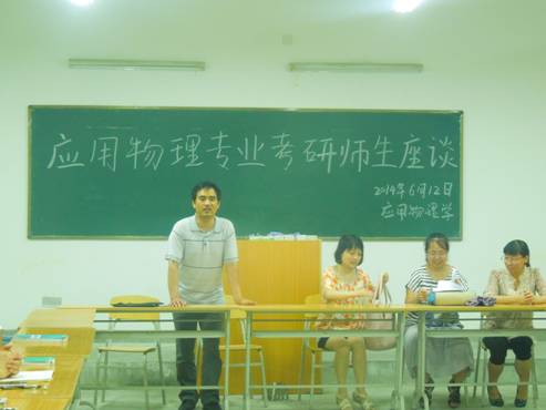 2014年6月12日,2013级应用物理专业在江北校区1311教室召开了“应用物理专业考研师生座谈会”, 物理教研室老师杨亦云、文艳妮、贾晓菲参加会议,会议由物理教研室主任方小兵老师主持。
