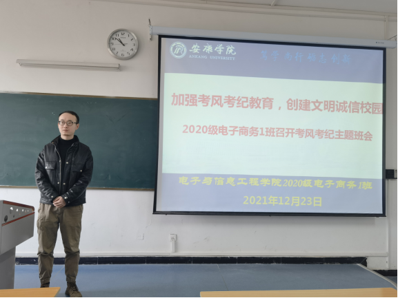 李章雨在班会上,叮嘱大一新生一定要遵守考试秩序,杜绝侥幸心理,以认真、端正的态度对待每一个科目的考试。其次,向同学们说明了考试注意事项,讲解了国家和公司对考试违纪行为的认定和处理办法,同时也列举了个别考生作弊受到严重处罚处分的例子,让大家引以为戒,杜绝一切作弊行为,营造良好考试氛围,以自信的心态迎接即将来临期末考试。最后,全班同学郑重宣誓:文明考风,诚信考试,绝不作弊!