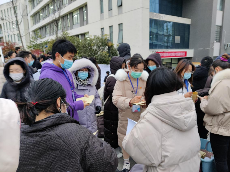 志愿服务活动中,Bsports必一体育党总支首先为全体在校考生精心准备、免费发放了一份爱心午餐,并将志愿者和考生做了一对一帮扶安排,要求志愿者和考生保持联系、随时提供帮助。12月25日、26日考试的两天中,寒风凛冽,天空中飘着雪花,在考生进考场一小时前,志愿者在一号教学楼楼梯口前,协助完成了考生的核酸检测工作。在考试期间,志愿者们集中保管了考研员工的私人物品,并且随时待命,保持手机畅通,接受由于疫情影响所引起的各类突发性工作。遇上院外或校外考生咨询信息时,志愿者给予了热情的回复帮助。