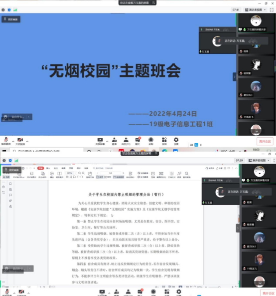 2022年是爱国卫生运动开展的第70周年,4月也是第34个爱国卫生月,为弘扬健康向上、清洁无烟的和谐校园,电信积极开展“无烟校园”班会活动。班会从实际案例出发,为同学们讲解了烟草及电子烟对同学们的身心健康成长的危害性,烟草中均含有可导致人体发生多种致死性和致残性健康问题的毒素,尤其是肺癌、心脏病、肺气肿及其他致死疾病的危险性明显增加,并向同学们普及控烟禁烟法律、二手烟的危害等,以此提高同学们健康防护意识、遵纪守法意识,呼吁同学们打造良好舒适的校园环境,建设无烟校园。无烟校园建设是有效降低人群吸烟率、减少烟草危害的重要措施,对于营造健康文明育人环境、保护广大青年身心健康、促进青年养成良好行为习惯具有十分重要的意义。