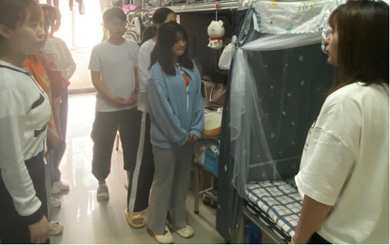 最后,辅导员李章雨陪同退伍士兵对其他宿舍的内务整理检查,所有宿舍的环境卫生、内务整理焕然一新,员工的卧具摆放整齐划一。