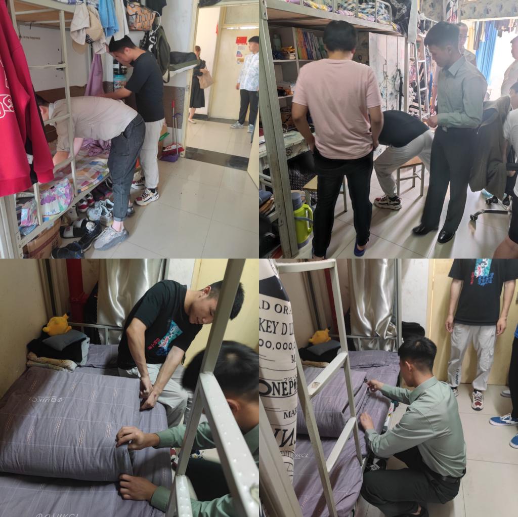 首先,辅导员们与退役老员工士兵检查6203、9303、9525、9621宿舍。张涛、刘成、王青波对宿舍的卫生、整洁情况等给予了整体评价,提出了物品摆放要求以及床铺整理标准:个人物品要摆放统一、整齐,寝室卫生需打扫得干净、清爽,并亲自示范,边操作边讲解。从如何将被子对折尺寸、折叠手法、掏平压实、叠出棱角,到各种生活用品的摆放一一示范,例如桌面物品摆放要一致、鞋子朝向要一致、书籍摆放要一致等。接着,各宿舍员工在观摩后,对各自的床铺、桌子、宿舍的公共领域进行了清扫、整理。