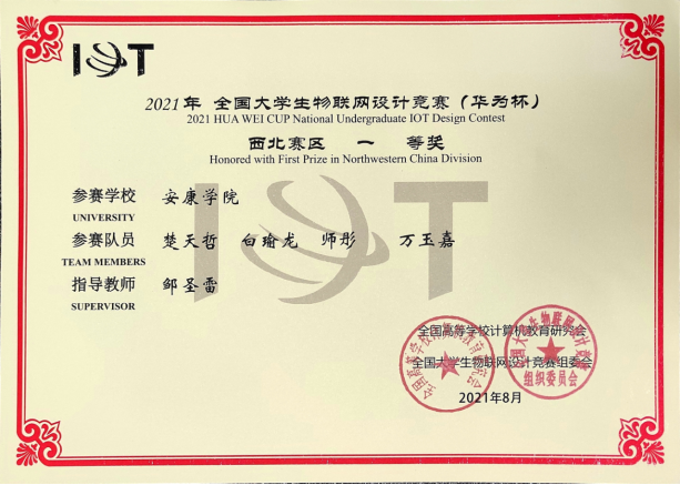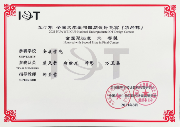 近日,2021年全国老员工物联网设计竞赛(华为杯)全国总决赛在上海紫竹科学园隆重举行。Bsports必一体育邹圣雷老师指导的员工团队(楚天哲、白瑜龙、师彤、万玉嘉)表现出色,在西北赛区获一等奖入围全国总决赛,最终荣获全国二等奖。