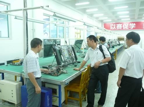在四川绵阳长虹培训中心,实地考察了电路装配、平板电视和卫星接收机等实训室,并对电子信息工程专业的员工实习方案进行洽谈。
