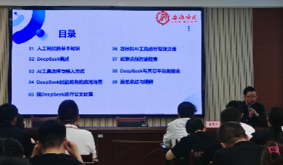 理论与实践并重,系统解析AI政务应用路径本次培训内容涵盖人工智能基础知识、AI工具选择与接入方式、DeepSeek大模型在政务场景中的创新应用、人机高效交互技巧,以及跨平台协同应用等核心模块。王克刚教授以政务办公中的公文撰写、数据分析、政策解读等高频需求为切入点,结合DeepSeek大模型的实际操作演示,生动展现了AI技术在提升政务服务效率、优化决策质量方面的突破性作用。促进学员深入掌握提示词优化、多轮对话管理等核心技能,有效提升了对培训学员对AI工具的实际操作能力。