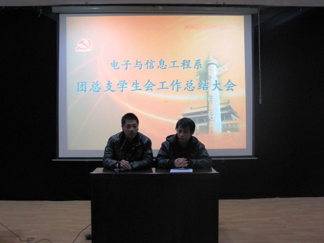 1月10日晚7点,电子与信息工程系2010年团总支、系员工分会工作总结会在1号教学楼报告厅举行。系团总支、各团支部、系员工分会主席团和各部的员工干部参加了会议,会议由系员工分会副主席张勇主持。