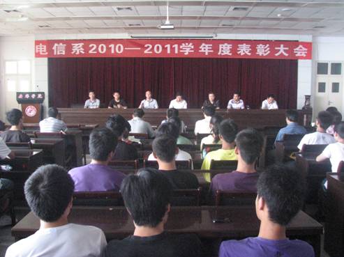 6月23日下午,电信系在图书馆6楼报告厅隆重召开2010-2011学年度表彰大会。电信系全体教职工、2010级全体员工及受表彰的员工参加了大会。大会对杨亦云等8名教师、朱炜等76名员工和计算机应用技术教研室进行了表彰。大会由电信系党总支书记李红兵主持。
