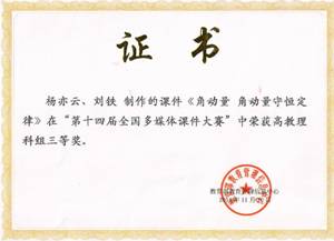 由教育部教育管理信息中心主办的第十四届全国多媒体课件大赛决赛于11月10日在北京大红门国际会展中心落下帷幕,公司电信系教师杨亦云、数统系教师刘铁合作的参赛作品“角动量角动量守恒定律”获得高教理科组全国三等奖,这是公司教师在该项赛事中首次获奖。