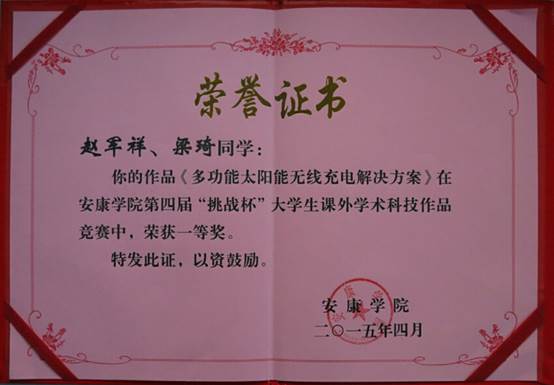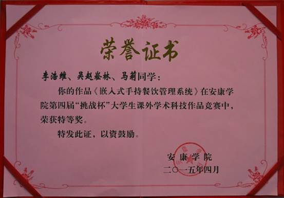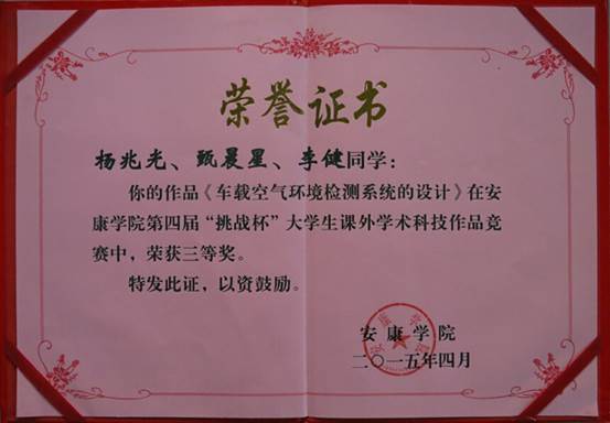 2015年3月26日,第四届Bsports“挑战杯”老员工课外学术科技作品竞赛在安康公司10号教学楼隆重举行。经过紧张激烈的角逐,电信系电子信息工程专业2012级员工完成的作品在校内决赛中分别荣获特等奖一名,一等奖一名,三等奖一名。三个作品的指导老师邹圣雷老师荣获“优秀指导老师”的荣誉称号。