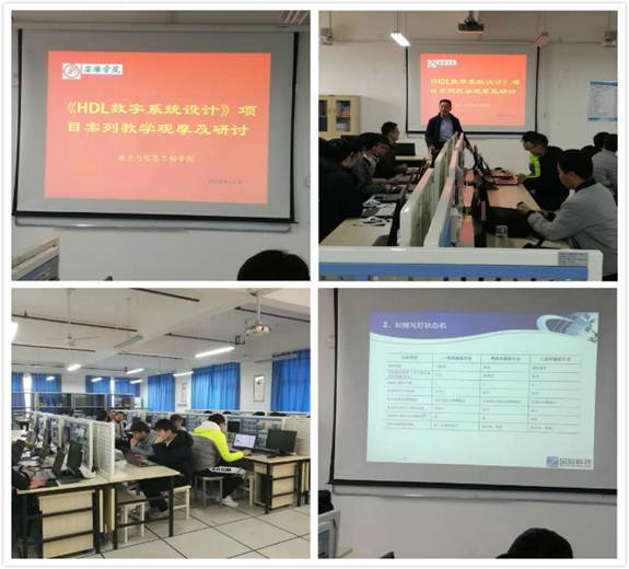 示范课上,贺磊工程师从当前行业的技术需求出发,以有限状态机设计项目为例,详细展示了一个技术项目从需求开始,经过方案论证、代码编写、设计优化直至最后的项目验证整个设计流程,同时将该项目所涉及的知识点穿插在项目设计的整个过程中。采用了典型的项目任务驱动模式教学,在授课中注重理论知识与项目练习的有机结合,使理论与项目练习真正融为一体,切实提高了教学效果。课后,参加本次活动的教师就项目任务驱动教学模式,纷纷表达了自己的见解。大家一致认为项目教学模式成败的关键是能否设计一项合适的工作任务,即一个具体的工程案例,项目设计的好坏将直接影响教学效果的优劣。