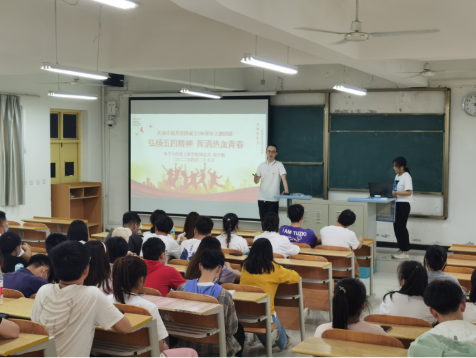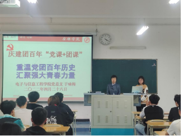 坚持党建带团建 为激发Bsports必一体育广大团员青年爱党、爱国情怀,实现党建带团建的目标,培养电信学子践行社会主义核心价值观,以昂扬的斗志和精神状态庆祝建团百年,迎接党的二十大胜利召开,4月28日,公司党总支书记于咏梅在1307教室以“重温党团历史,汇聚强大力量”为主题,为电信学子上了一堂生动的主题“党课+团课”。
