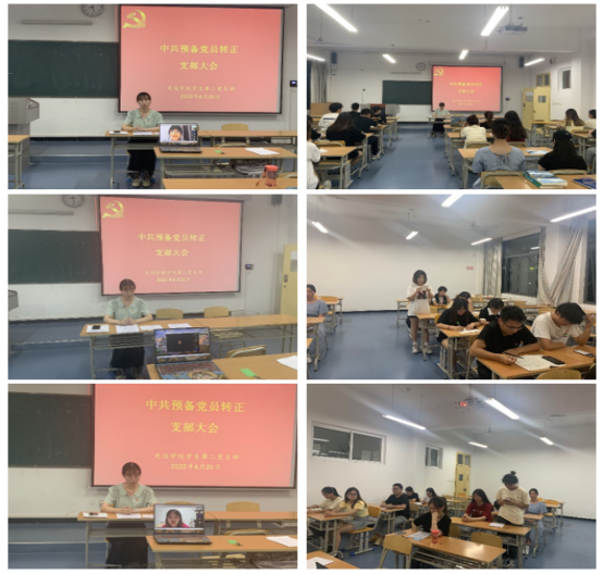 会上,陈凡、刘艳红、尚佩瑶、赵东勃、黄娥、李思雨、许梦等7名中共预备党员,向党组织汇报了对中国共产党的认识、对党的理论知识的学习情况,以及个人预备期内在思想、学习、工作、生活等各方面的表现,结合个人所学所思所感,表明今后学习和工作的努力方向。因工作原因,黄娥、刘艳红、尚佩瑶3名同学无法返校参会,通过远程视频进行了汇报。7名预备党员的培养老师分别从思想、学习、工作和生活以及对其教育考察情况向支部大会作了详实的介绍,并对其培养党员能否转正表明意见。