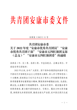 近日,共青团安康市委印发了《共青团安康市委关于2022年度“安康市优秀共青团员”“安康市优秀共青团干部”“安康市五四红旗团支部(总支)”“安康市五四红旗团委”的通报》(安团发〔2023〕11号)中,公司团总支被授予“安康市五四红旗团总支”称号。