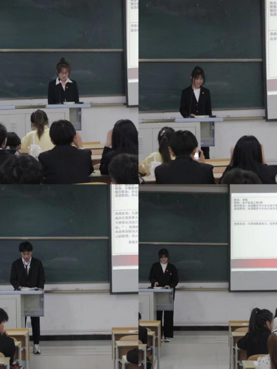 参与团总支、员工会、社团服务中心干部竞选的同学根据换届选举竞选要求,依次上台进行5分钟竞选演讲。竞选环节中,各位参选同学满怀信心和激情,以端庄大方的仪态和饱满的精神状态走上舞台,就自己的基本情况、对工作岗位的认知、竞选原因以及工作设想进行了演讲。激烈慷慨的演讲将此次竞选会议一次次推向高潮,赢得了大家热烈的掌声。