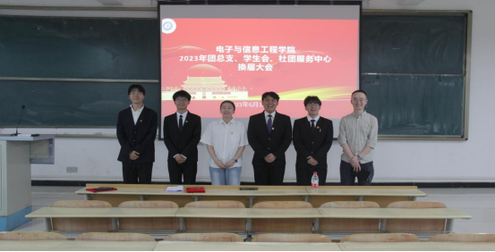 会后团总支副书记任金笑、员工会主席杨琪、社团服务中心负责人张炬与团总支书记张宇航合影: