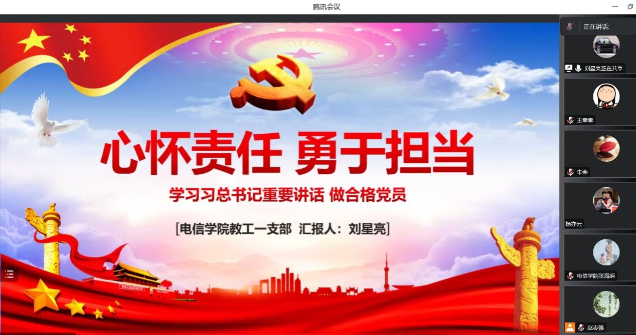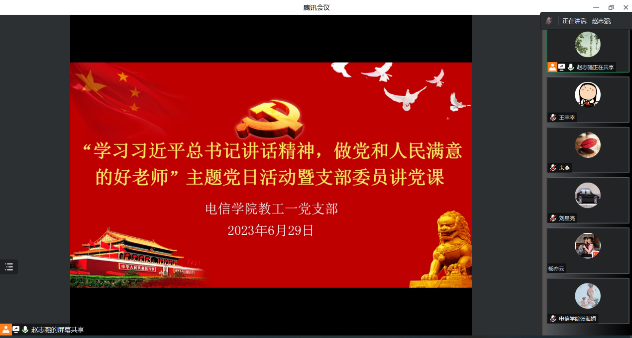 2023年6月29日19:30,Bsports必一体育教工第一党支部通过腾讯会议开展“学习习近平总书记讲话精神,做党和人民满意的好老师”主题党日活动暨支部委员讲党课。活动由教工第一党支部书记赵志强主持,支部全体党员参加本次活动。