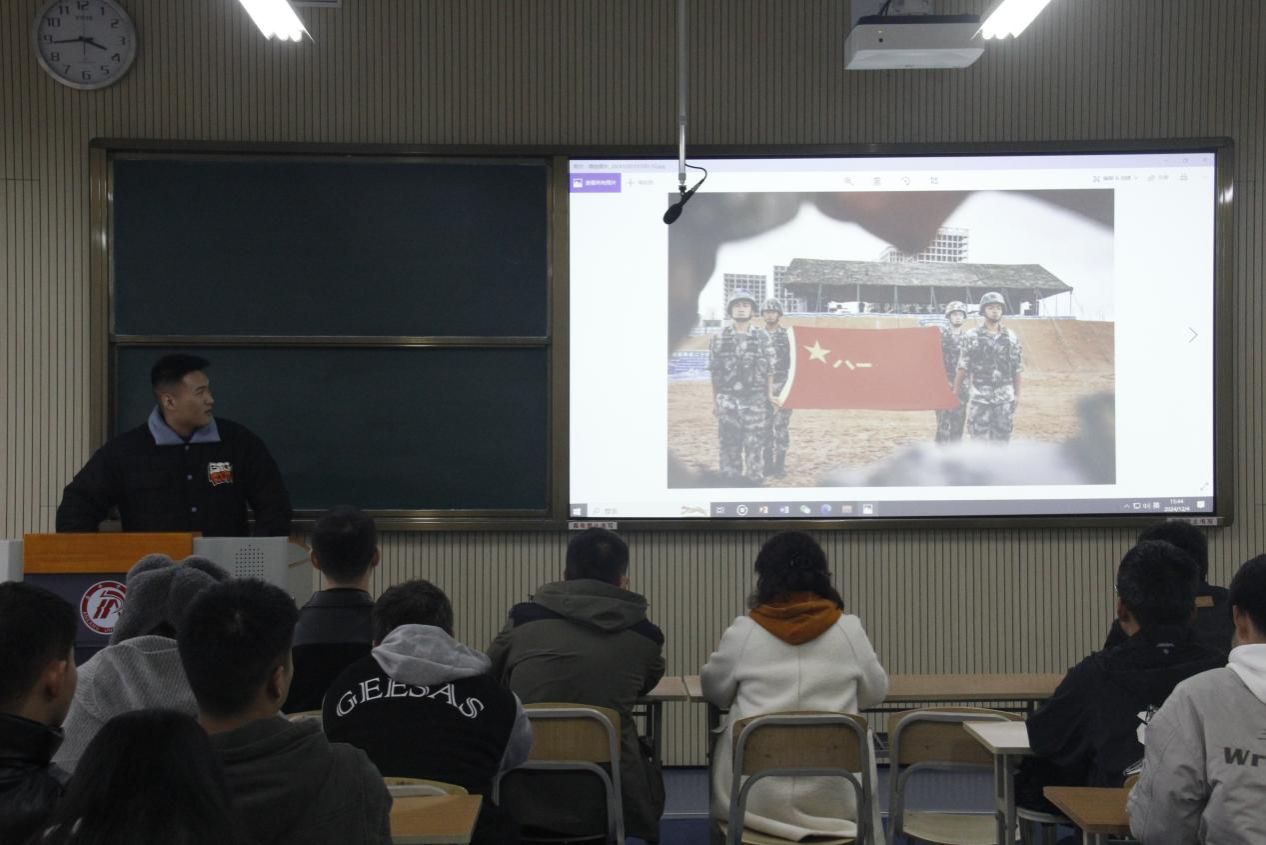 2024计算机科学与技术1班李旋杨,原服役于中国人民解放军武警某部。他从小就将参军梦的种子深埋心中,在2022年如愿以偿踏上了入伍的列车,成为了一名光荣的边疆卫士。李旋杨同学在会上激情讲述了他是如何从一名普普通通的士兵,通过不断突破自我、迎难而上逐渐成长为一名优秀的军人。
