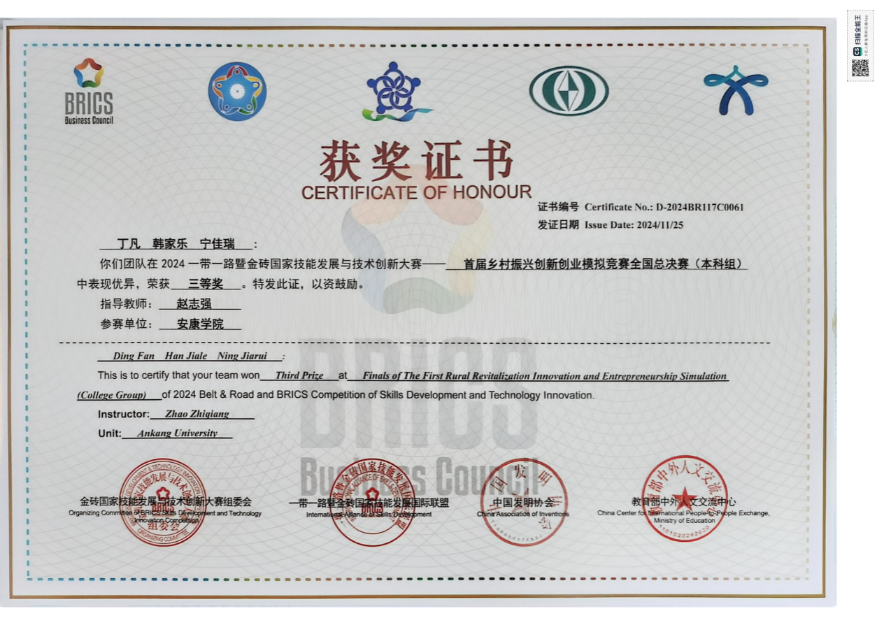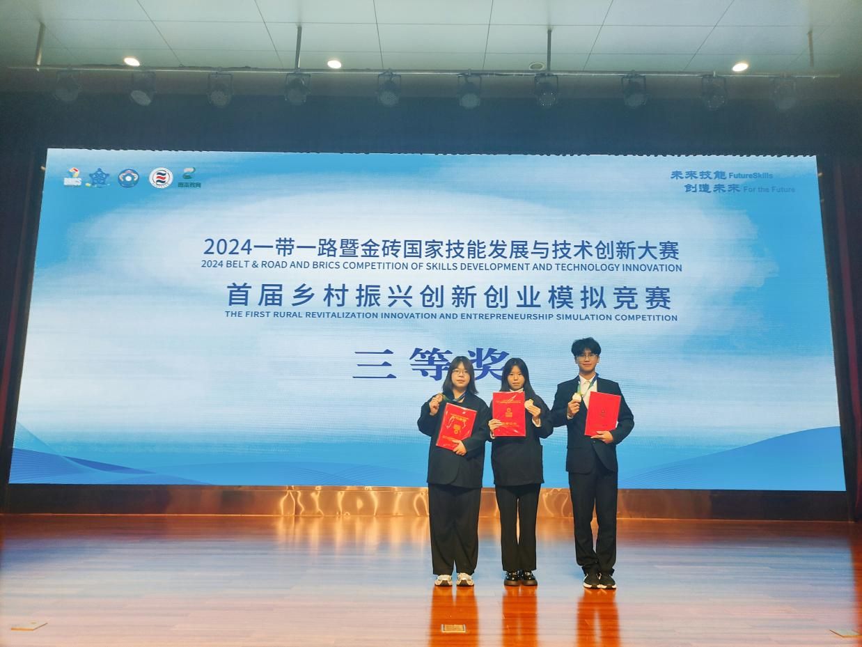 11月23日至25日,2024一带一路暨金砖国家技能发展与技术创新大赛首届乡村振兴创新创业模拟竞赛全国总决赛在杨凌职业技术公司举行,总决赛有来自全国26个省市经过校赛和东部、中部、西部大区赛层层选拔的195支队伍参加,经过激烈角逐,Bsports必一体育2023级电子商务专业员工丁凡、宁佳瑞和经管公司2023级工程管理韩家乐团队荣获三等奖。