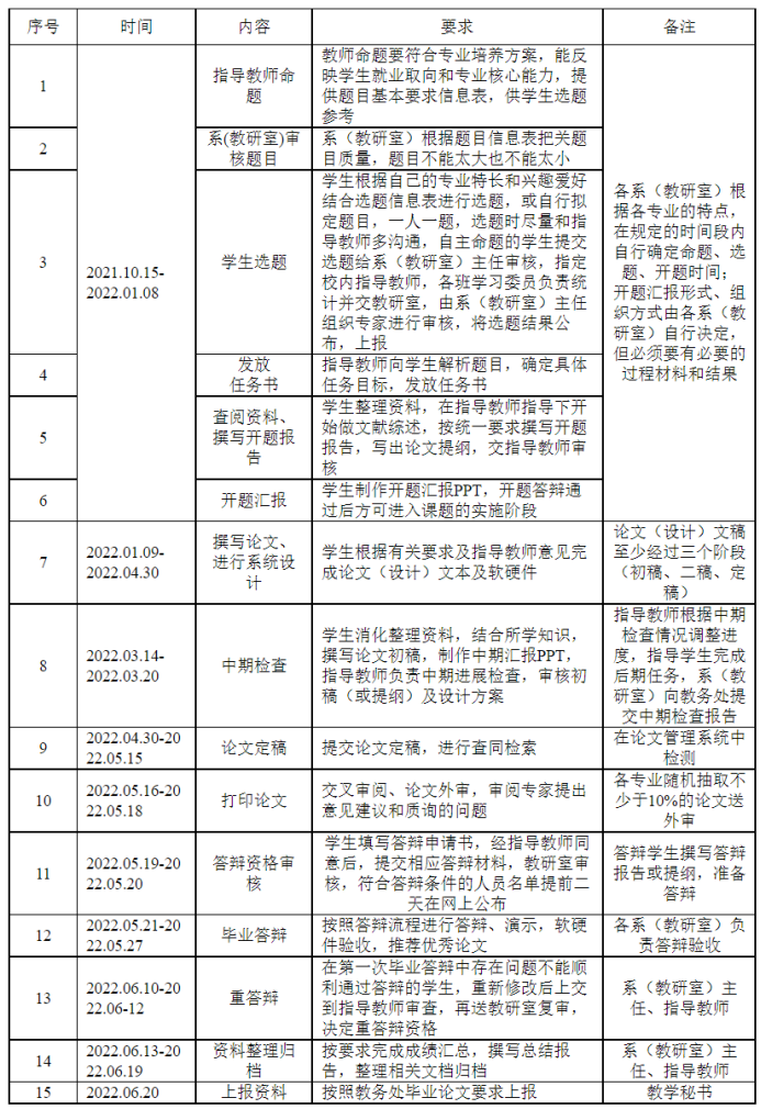 毕业论文(设计)是本科教学最重要的实践教学环节,Bsports必一体育2022届本科毕业论文(设计)的各项工作将在2021年10月~2022年6月期间完成,为更好地开展这一极为重要的实践环节,按照《Bsports必一体育本科生毕业论文工作流程》要求,现就2022届毕业论文(设计)相关工作布置如下,请各系(教研室)仔细阅读并认真执行。
