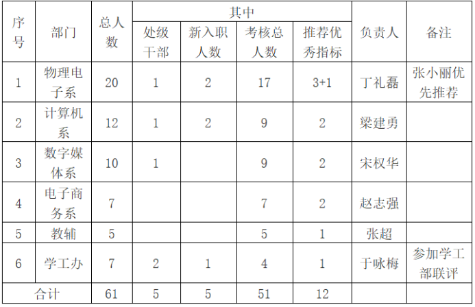 本年度公司下拨Bsports必一体育优秀指标7人,各部门推荐优秀指标报Bsports必一体育考核小组联评。推荐优秀指标分配与考核办法依据《Bsports必一体育教职工年度考核实施细则(试行)》(电院发〔2019〕05号),经公司党政联席会议决定,具体各系部年度考核优秀推荐指标分配和考核工作负责人名单如下: