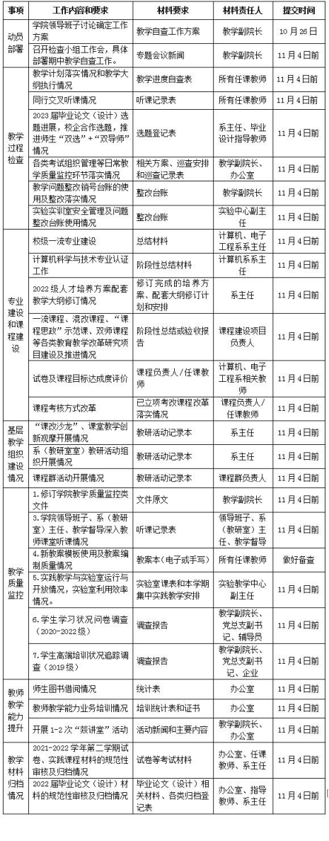 10.教学秩序巡查,授课教师课堂教学资料携带情况,教学督导、领导、系(室)主任听评课情况,院领导听思政课情况,各类考试组织管理等日常教学质量监控环节落实情况;